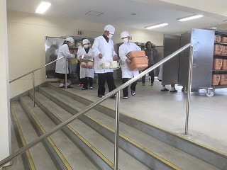 皆が楽しみにしている給食の時間ですが,安全で安心して食べられる給食の時間にするために,下の写真のように,当番の服装や健康状態等を確認したりコンテナ室内で係の職員が見守ったりするなど,衛生面には十分に気を付けています。